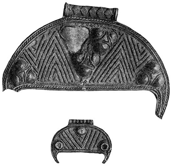 Рядом с трехбусенными височными кольцами нужно поставить предметы также с тремя бусинами, но представляющие как бы распрямленное височное кольцо, стержень которого вытянут в прямую линию. В археологической литературе они известны под названием застежек или «аграфов»[687]687