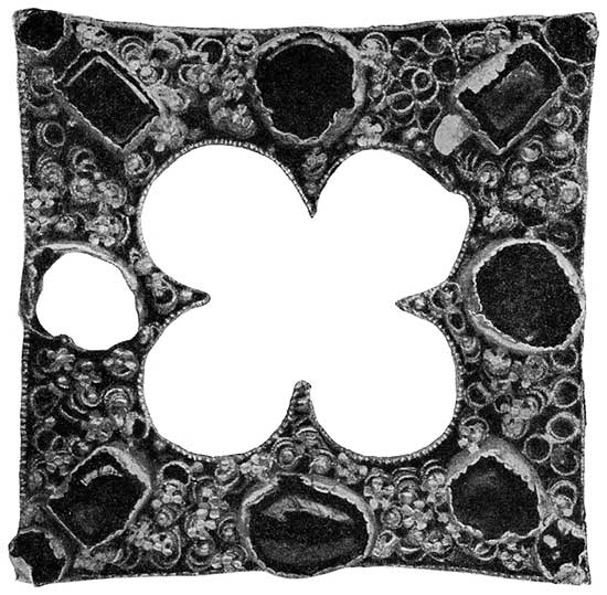 [Закрыть]. Большие золотые плоскости расчленялись вставками самоцветов, между которыми располагались завитки скани. Для создания большей глубины и рельефности рисунка мастера проковывали скрученные золотые нити в тонкую полоску с рубчатым верхним краем и эти полоски на ребро припаивали к золотой пластинке[697]697