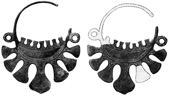 В Тушинской курганной группе найдена пряжка с характерным криновидным хвостом. Совершенно такая же пряжка, литая в той же форме, найдена в курганах близ Мякинина; Тушино и Мякинино (расстояние 8 км). Очевидно, неизвестная нам мастерская, продукцию которой мы встречаем на всех соседних кладбищах, вырабатывала височные кольца, перстни, пряжки[907]907