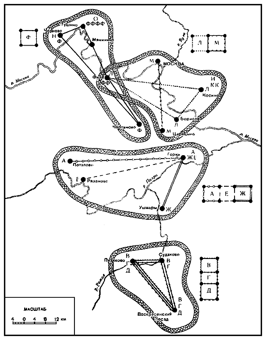 Продвигаясь все далее на север, мы встречаемся с новыми литейными формами. Кольца, литые в форме З, встречены в Спас-Тушине (4 экз.), в Черневе (1 экз.), в Филях (2 экз.), в Чертанове (1 экз.). Все поселки вытянуты вдоль реки Москвы. Расстояние 21 км. Рядом с этим районом располагается другой – литейная форма Л (Фили-Косино-Борисово), и тут же поблизости форма М (курганы на месте Московского Кремля и в Царицыне). Расстояние – 17–19 км.