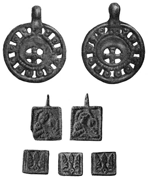 Перейдем к смоленским кривичам. В качестве примера укажу решетчатые ромбические подвески, также литые в одной литейной форме. Один комплект их найден в б. Дорогобужском уезде (раскопки Спицына и Эйбоженко), другой – в соседнем с ним Юхновском (раскопки Булычова). Хотя точный пункт в первом случае неизвестен, но, зная район работ Спицына и Эйбоженко, расстояние до раскопок Булычова – около 20 км. На территории северян нормальный район сбыта также не превышает обычных норм. Круглые подвески с ложно-зерненым орнаментом, сделанные одним мастером, найдены в двух близких курганных группах: Гочево и Белогорье (около 20 км).