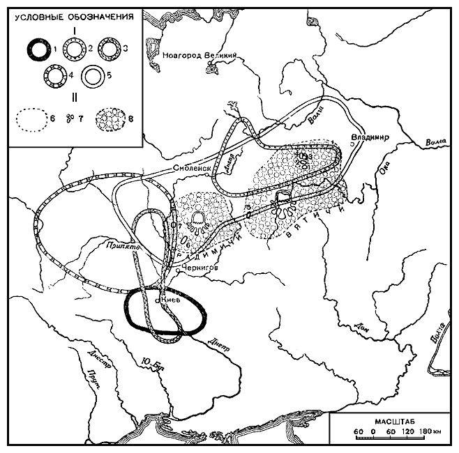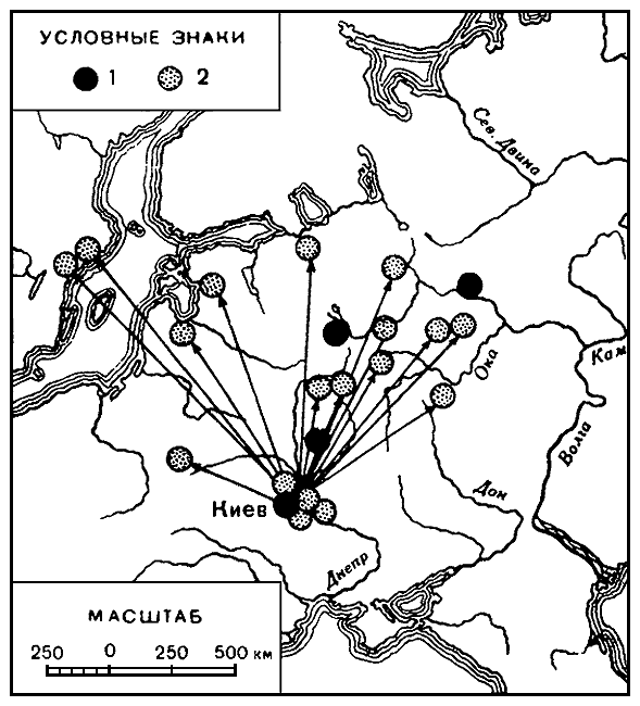 Сочетание всех перечисленных фактов делает данные предметы очень важными для решения вопроса о взаимоотношении города и деревни в XI–XII вв. Изложу кратко выводы, вытекающие из анализа карты распространения выемчатых эмалей (см. рис. 106):