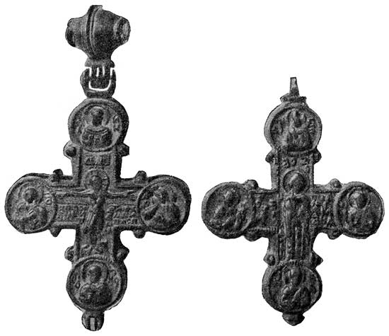 Крест-складень – литой из бронзы с тщательной скульптурной работой, но с обратными надписями, происшедшими оттого, что мастер резал их прямо на литейной форме; поэтому на отливке они получились негативными. (Рис. 105). Дата устанавливается по находкам их в Киеве в комплексах 1240 г. (землянка близ Михайловского монастыря и тайник Десятинной церкви, через который киевляне пытались бежать во время осады города Батыем).