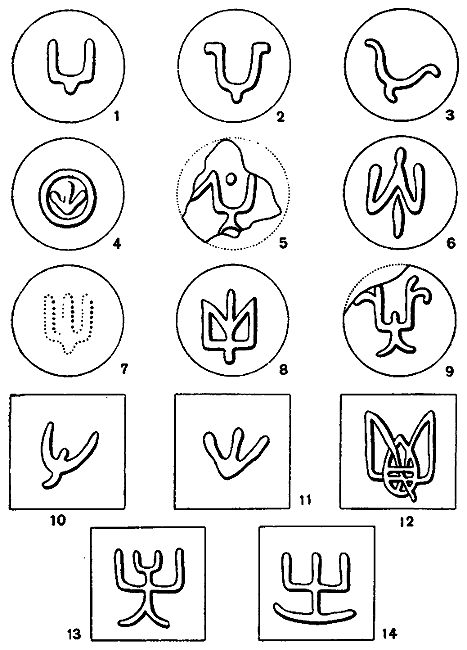 10–14 – княжеские знаки на кирпичах: 10 – Чернигов, 11 – Остерский Городец, 12 – Киев, гридница Владимира, 13 – Киев, 14 – Смоленск.