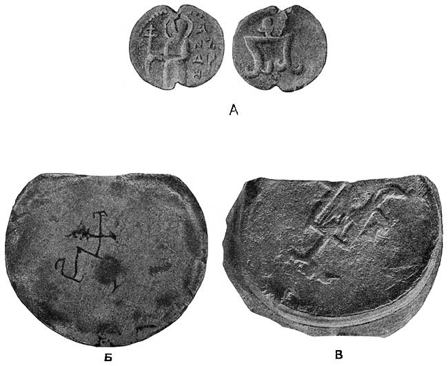 А – знак князя Всеволода Ярославича на печати; Б – такой же знак на инструменте ювелира (матрице); В – гончарное клеймо с княжеским знаком.