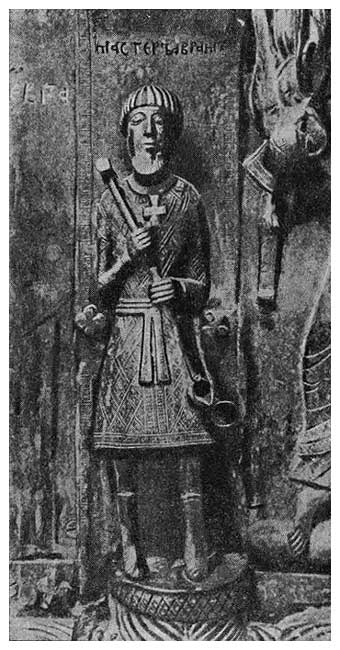 Интереснейшим изображением древнерусского мастера литейщика является скульптурный портрет новгородского мастера, находящийся на так называемых «Корсунских» вратах Софийского собора (рис. 133)[1249]1249