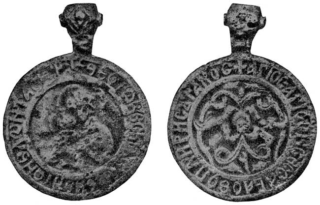 [Закрыть]. Его лицевая сторона дает знакомый нам по киевским экземплярам рисунок с обратной надписью, а обратная содержит очень близкую композицию, но другого, сильно огрубленного рисунка, лишь в общих чертах напоминающего киевское изделие. На других экземплярах того же типа мы можем шаг за шагом проследить, как постепенно утрачивалась первоначальная форма киевского образца, как позднейшие мастера подправляли неизбежно разрушавшийся рельеф.