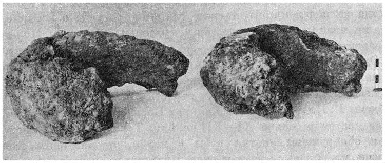 Отходы сыродутного процесса называются шлаками («сок», «жужелица», «жужло»). Чем тяжелее шлак, тем меньше переплавлено из него железа. Наличие шлаков на городищах всегда является признаком местной выработки металла. По окончании «варки» железа, для того чтобы получить крицу, необходимо было разломать домницу и удалить все посторонние примеси. Крицу из печи извлекали ломом или пешней. Горячая крица захватывалась клещами и тщательно проковывалась. Без проковки крица не могла идти в дело, так как полученный металл был слишком порист. Проковка удаляла с поверхности крицы частицы шлака и устраняла пористости. После проковки крицу снова нагревали и снова клали под молот. Эта операция повторялась несколько раз. Крицу иногда дробили на куски, и каждый кусок проковывался отдельно или же проковывали всю массу железа. В первом случае получались небольшие продолговатые болванки весом около 200 г (Банцеровское городище близ Минска VIII–IX вв.), а во втором – массивные куски железа весом в несколько килограммов. Так, например, найденная в Райковецком городище прокованная крица весила 5 кг. В Вышгороде под Киевом при моих раскопках в 1935 г. были найдены 2 крицы, имевшие форму приплюснутого шара, разрубленного еще в горячем состоянии по радиусу от середины к краю (рис. 17). Рубили, очевидно, для того, чтобы посмотреть качество проковки[295]295