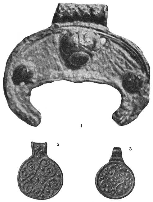 1 – литая лунница, подражающая зерни; 2 – подвеска с филигранью и зернью (городская); 3 – подвеска, отлитая по оттиску в глине.