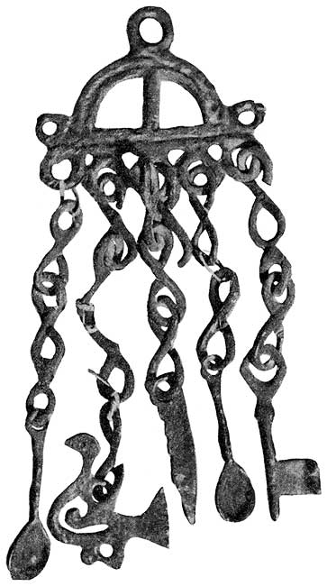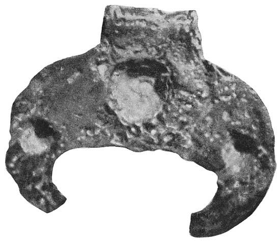 Если же нужно было сделать отверстие не в плоскости самой вещи, а, например, ушко для подвешивания к ожерелью, то для этого в форме делался каналец, перпендикулярный к литку, и в этот каналец вставлялся железный стержень. Металл, вливаясь через литок, должен был обтекать вставленный стержень, и, когда стержень убирали, получалось отверстие. Орнамент, вырезанный в форме в глубь нее, на готовой вещи, естественно, получался выпуклым.