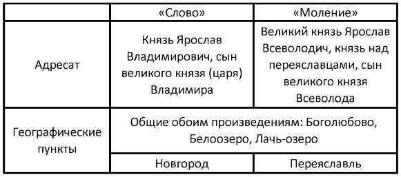 Интересны отличия двух списков географических названий. В том перечне, который связан с Ярославом Владимировичем («Слово»), стоит Новгород, отсутствующий в «Молении», где список северо-восточных пунктов открывается Переяславлем (которого нет в «Слове»).