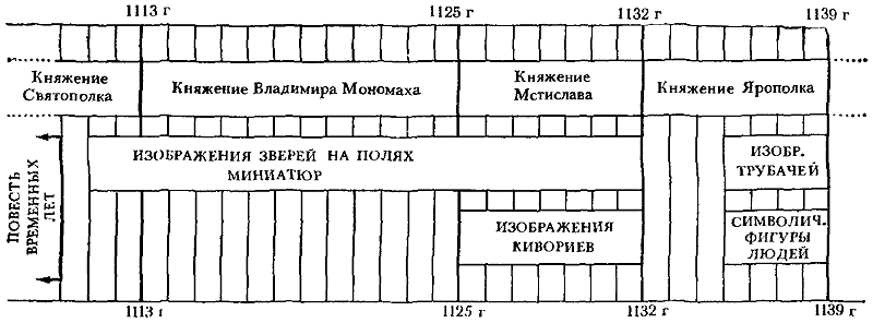 Рассмотрим все виды пририсовок (звери, трубачи, символические фигуры) в целом и сопоставим обозначенные ими разделы летописи со сроками княжения великих князей Киева. В краткой форме эго было изложено еще в 1946 г.[278]278