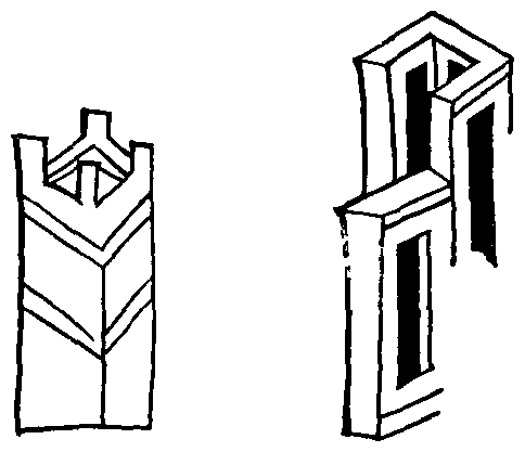 Осталось сказать несколько слов о тех особенностях архитектурного фона, которые отмечены на графике как характерные только для эпохи Мстислава. Как правило, архитектурные элементы в виде башенки, будки или византийской схемы четырехбашенного условного города очень просты и однотипны примерно до середины XII в. С 1117 г., т. е. с того времени, как новая летопись попала под наблюдение Мстислава, приехавшего в этом году к отцу в Киев, появляется совершенно новая манера изображения архитектурного фона: вместо условных городов художник дает систему стен, примыкающих друг к другу под прямым углом и прорезанных прямоугольными проемами (л. 156 о. н.; 157 н.; 157 о. в.; 157 о. н.) (рис. 58). Иногда появляется изображение коробового свода (л. 157 о. в.; 161 в.).