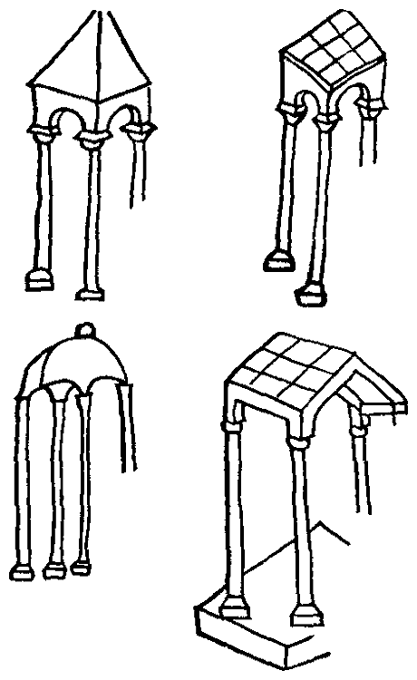 Заменой этих конструкций в определенных случаях являются тщательно исполненные рисунки кивориев. Кивории и сходные с ними двускатные навесы на колоннах отмечают важнейшие государственные дела братьев «Володимиричей» Мстислава и Ярополка: