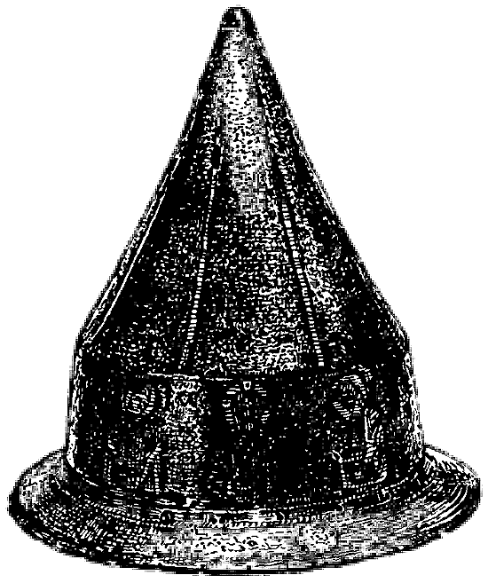 В этой серии миниатюр о личной храбрости Андрея интересна миниатюра (рис. 62), изображающая князя в своеобразном шлеме (л. 185 в.). Шлем подобной формы во всей Радзивиловской летописи встречен только один раз, здесь. Шлем отличается наличием широких полей и султана. Именно такой шлем XII в. византийской работы с незапамятных времен хранится в Московской Оружейной палате (рис. 63). Нам неизвестно его отношение к Андрею, но мысль о том, что он мог принадлежать правнуку византийского императора и одному из основателей владимирского княжества, не лишена вероятия. При Андрее Боголюбском эти эпизоды под Луцком и могли быть вставлены в общее повествование.