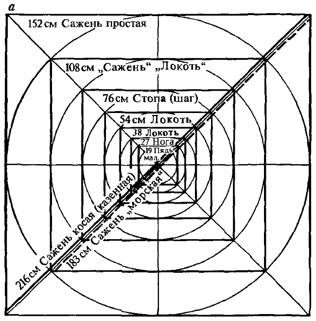 Возможно, что именно их геометрическая сопряженность и позволила им сохраниться на Руси в таком полном комплекте. Одна мера была основной («мерная сажень»), а другие были геометрическими производными от нее и могли служить при тех или иных пропорциональных расчетах[140]140