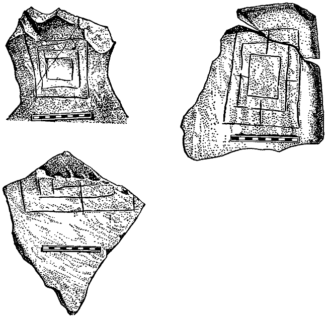 1. В фундаментах шестигранного здания хазарского периода (IX – начало X в.), построенных из камня и кирпича закавказского типа, найден обломок глиняной плиты, на которую в сыром виде нанесли чертеж, состоящий из вписанных прямоугольников.