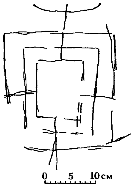 Вся фигура имеет вид как бы трех букв П, написанных одна в другой и опирающихся на общую черту; над верхним П начерчена небольшая дужка. Следует особо отметить, что человек, исполнявший этот чертеж, был очень тщателен и стремился нанести линии с максимальной точностью, соблюдая их параллельность и правильность прямых углов.