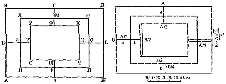 Обозначим все точки нашей фигуры буквами русского алфавита, – перечислим соотношения линий. В основе фигуры лежат шесть пар прямых линий (сторон прямоугольников), разделенных пополам, и две пары пересекающих их линий, каждая из которых разделяется на две неравные части. Если же учитывать не только изображенные на чертеже линии, но и те, которые могут быть проведены от точки к точке, то количество линий возрастет до 42 (рис. 19).