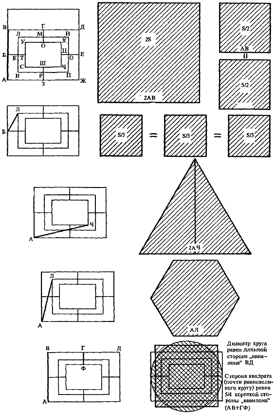 Линии «вавилона» образуют несколько пропорциональных рядов. Вот, например, один из них: МФ:МГ = МГ:БК = ГФ:БТ = УС:УХ = АВ:ВД.