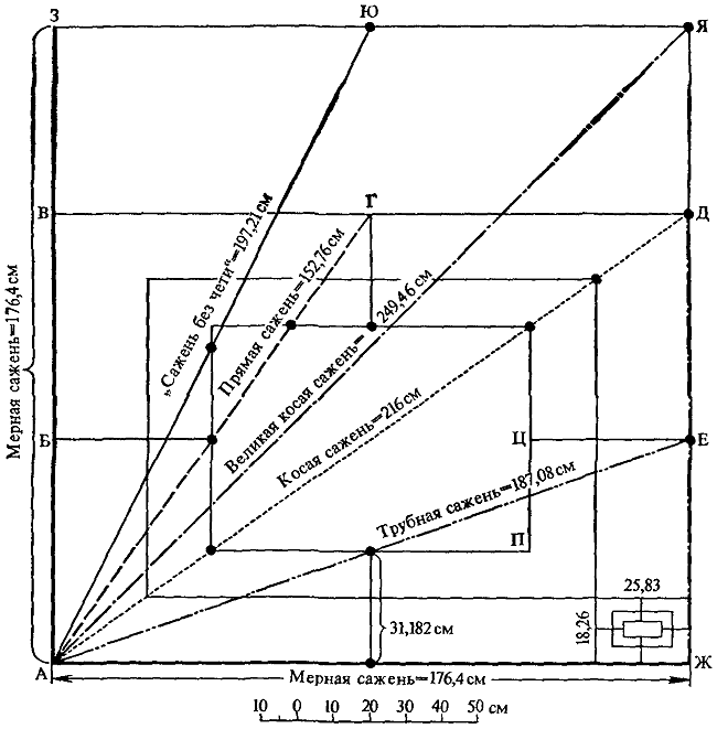 Рис. 22. Древнерусские сажени в их отношении к мерной сажени (176,4 см).