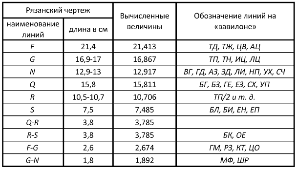 Степень точности рязанского чертежа ясна из следующей таблицы, где фактические размеры сопоставлены с размерами «вавилона», вычисленными алгебраически с точностью до трех знаков.