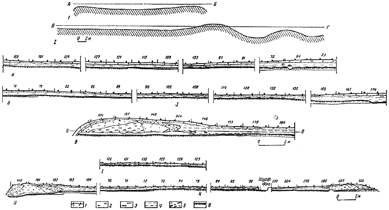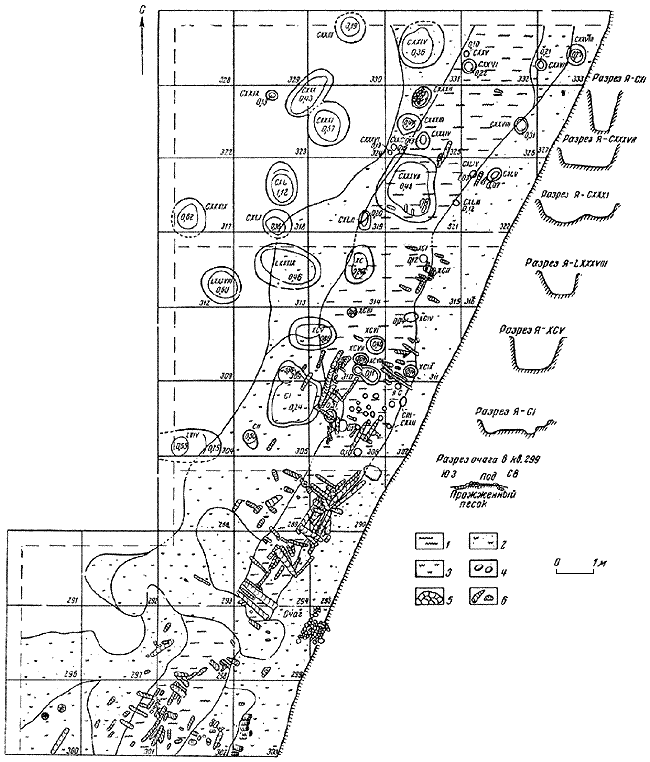 I – план участка раскопа, прилежащего к большому валу 1: 1 – обожженная глина; 2 – прожженный песок; 3 – зольная насыпь вала; 4 – углистый слой; 5 – обожженное дерево; 6 – камни.