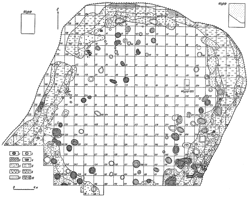 1 – ямы с зарубинецкой керамикой; 2 – ямы с керамикой середины I тысячелетия н. э.; 3 – большие скопления керамики; 4 – камни; 5 – гумированная супесь; 6 – зола; 7 – уголь; 8 – прожженный песок; 9 – песок; 10 – обожженная глина.