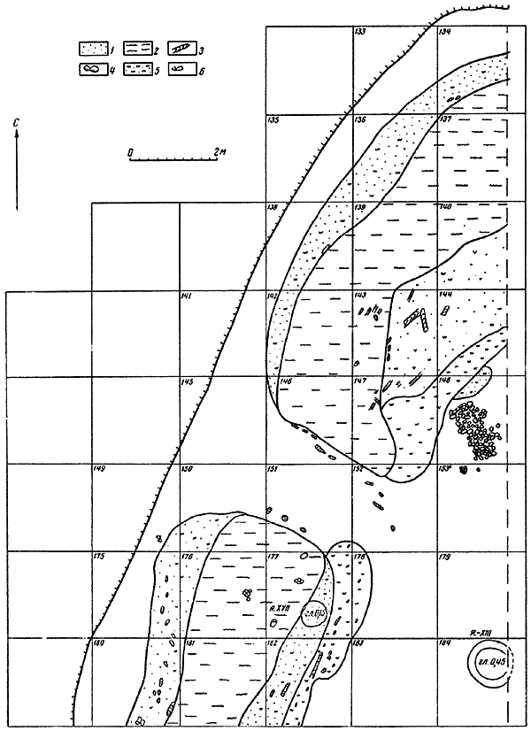 1 – песок; 2 – зола; 3 – обугленное дерево; 4 – камни; 5 – прожженный пестрый песок; 6 – скопления керамики.
