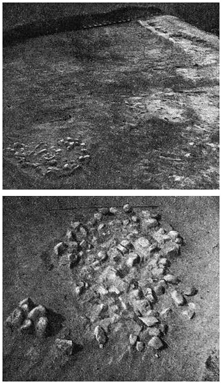 Вверху – зачистка на месте главного входа на городище, с северо-востока; внизу – очаг из камней у главного входа на городище в квадрате 148, с юго-востока.
