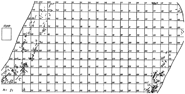 Нами уже было отмечено, что городище вскрыто полностью, но для контрольных целей оставлена нераскопанной небольшая площадка около 30 кв. м в юго-восточном углу его. Половина ее изуродована круглой воронкой или артиллерийским гнездом военного времени, другая же половина является контрольным участком. Поскольку работы производились в течение нескольких лет, площадь вскрывалась по частям, причем каждый новый участок начинался со следующего по порядку номера квадрата размерами 2×2 м.