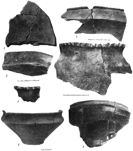 В настоящее время трудно сказать, какие размеры для этих горшков следует признать типичными. Очевидно только, что совсем маленьких сосудов такого типа не изготовляли. Однако крупные толстостенные сосуды подобного профиля встречались нередко. Их диаметр достигал 35 см. Среди них есть несколько фрагментов, примитивно украшенных налепным горизонтальным валиком, идущим несколько ниже края венчика и покрытым косыми насечками (рис. 20, 1, 3).