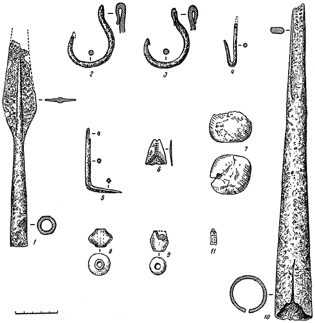 Рис. 25. Железные, бронзовые и глиняные изделия, найденные на городище Колочин (1-11).