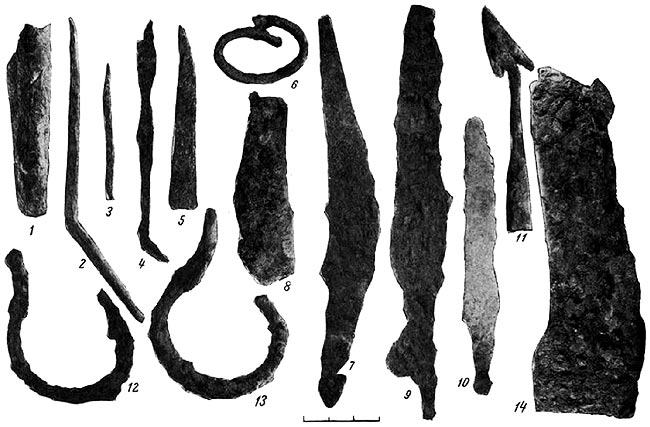 1 – костная поделка; 2–4 – железные шилья; 5 – железное долото; 6 – железное кольцо; 7-10 – железные ножи; 11 – наконечник дротика; 12, 13 – рыболовные крючки; 14 – обломок косы.