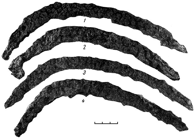 Вторая находка земледельческих орудий – клад из четырех серпов, обнаруженный в квадрате 307 на глубине 0,55 м. Серпы лежали среди углей. Они были брошены в ямку, вырытую у самой поверхности, видимо, при поспешном бегстве. На это указывает положение серпов. Один из них лежал вертикально, другие плашмя, в беспорядке. Все серпы имели перпендикулярный выступ для прикрепления к рукояти. Они слабо изогнуты, причем изгиб сделан несколько более резким неподалеку от места прикрепления рукояти (рис. 27, 1, 3, 4).