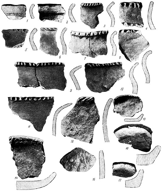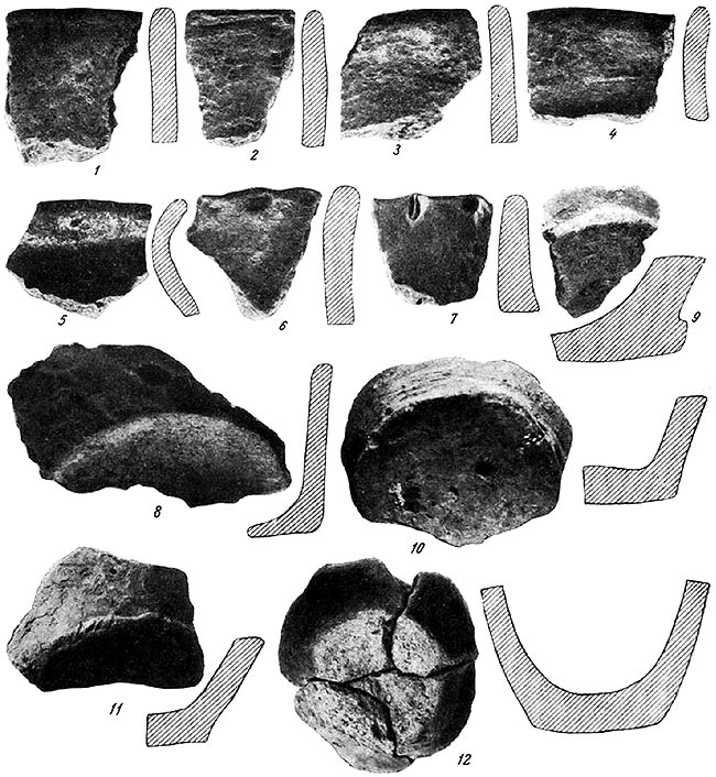 К первой из них относятся лепные сосуды горшкообразной формы с шероховатой поверхностью, иногда с примесью кусочков кварца в глине. Венчики таких сосудов большей частью прямые (рис. 3, 1) или лишь слегка отогнутые наружу (рис. 3, 2). Они чаще всего орнаментированы. Орнамент бывает по самому краю венчика (рис. 3, 6) или же непосредственно под ним (рис. 3, 4). Иногда он имеет вид обычных небольших насечек, расположенных прямо (рис. 3, 4, 5) или косо под разными углами, обращенными в разные стороны (рис. 3, 3, 6, 10, 12). На венчиках некоторых сосудов встречается желобок (рис. 3, 4, 7, 9) и орнамент в виде отпечатков пальцев (рис. 3, 8, 11). По тулову этих сосудов орнамента нет. Значительно меньше сосудов этой группы не имели никакого орнамента на своих венчиках (рис. 3, 1, 2).