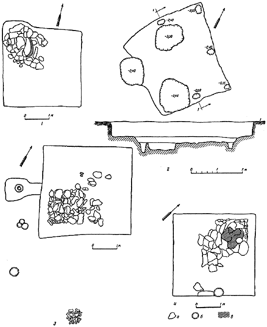Жилище 3 (рис. 2, 1; 3, 2). Это четырехугольная полуземлянка, опущенная в землю на 15–20 см от древнего горизонта или на 0,65-0,70 м от современной поверхности, ориентированная углами по странам света. Ее стены имели размеры: северо-западная – 2,6 м, северо-восточная – 3,7 м, юго-восточная – 3,1 м, юго-западная – 3,3 м. В жилище было несколько ям. В углах и около середины северо-восточной стены хорошо прослежены ямки от столбов диаметром 20–25 см и глубиной 15–20 см. Две такие же ямки были в средних частях северо-западных и юго-восточных стен. Кроме ямок от столбов в жилище были три ямки гораздо больших размеров, видимо хозяйственного назначения. Яма у северо-западной стены была поздняя и к конструкции жилища не имела отношения. Яма у северо-восточной стены была неправильной формы, и диаметр ее около 1,2 м, глубина 30 см. У северо-западной стены была такая же яма глубиной 35 см.