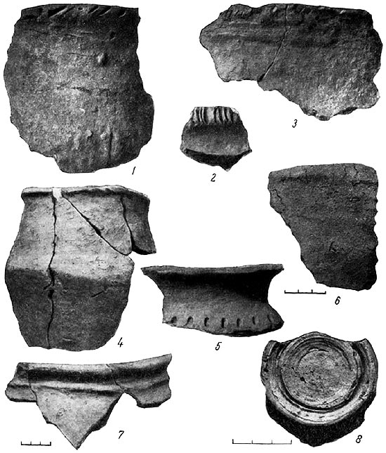 [Закрыть]. Они представляют собой обломки лепных тонкостенных сосудов темно-серого цвета с шероховатой поверхностью, с примесью слюды в глине. Края этих сосудов чаще всего совсем прямые, близко напоминающие края сосудов так называемой баночной формы (рис. 1, 1–3), реже слегка отогнуты наружу (рис. 1, 4, 5). На двух обломках края сосудов имеется орнамент из защипов (рис. 1, 6, 7). Донья этих сосудов плоские, без выступов-закраин (рис. 1, 8).