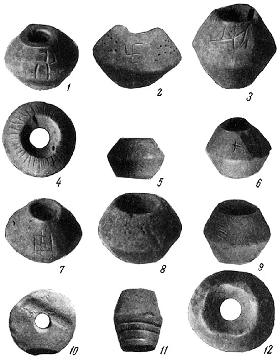 Рис. 12. Глиняные пряслица из поселения Луг I (1-12).