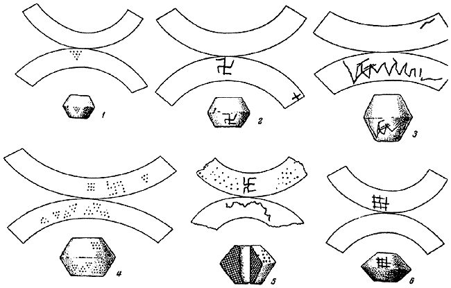 Рис. 13. Прорись орнаментированных пряслиц из поселения Луг I (1–6).
