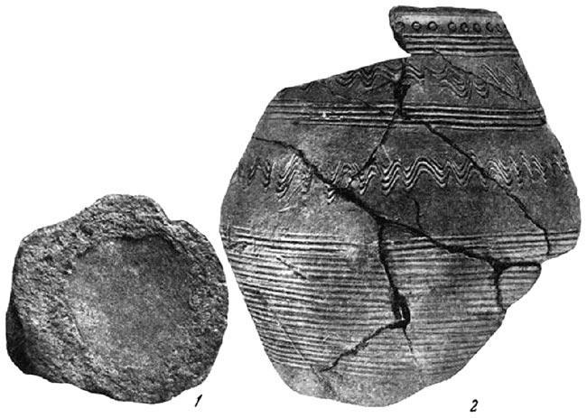 Среди камней, из которых была сложена печь, находились куски большого толстостенного сосуда, сделанного на медленно вращающемся гончарном круге из довольно грубого теста с песком. Сосуд по всей поверхности орнаментирован: ниже шейки вдавленными кружками, потом полосой с волной посередине и, наконец, линейным орнаментом почти до дна. Среди завала печи были обломки и второго сосуда – лепного горшка с небольшим венчиком, с защипами по краю, а также точильный брусок (рис. 15, 2).