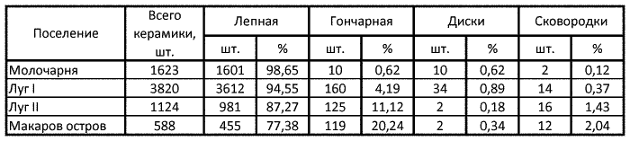 Таблица 1. Количество и процентное соотношение различных типов и видов керамики на Пеньковских поселениях.
