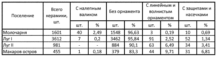 Сосуды с линейным и волнистым орнаментом с урочища Молочарня представлены тремя обломками (0,19 %). Практически с ними можно не считаться, так как совершенно очевидно, что к керамическому комплексу поселения они не относятся, а попали сюда из близко расположенного поселения в урочище Макаров остров. На урочище Луг I эта керамика составляет 2,52 %, на урочище Луг II ее уже 6,49 %, а на урочище Макаров остров – 9,71 %. Возрастание совершенно определенное.