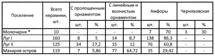 Все четыре поселения по времени следуют одно за другим, сосуществуя друг с другом на некоторых отрезках времени. Наиболее архаичное из них – это поселение урочища Молочарня, за ним по времени следуют поселения в урочищах Луг I, Луг II и Макаров остров. Для иллюстрации этого мы составили сводные таблицы 1–3 подсчетов керамики на Пеньковских поселениях.