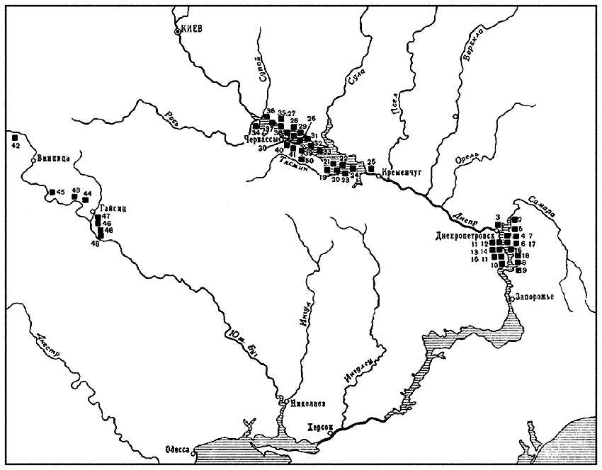 1 – с. Днепровск (б. Ямбург) Днепропетровского района, против центральной части; 2 – с. Игрень Днепропетровского района, на левом берегу р. Самары в 400 м от Днепра; 3 – Игрень Днепропетровского района, у самого устья р. Самары; 4 – Игрень Днепропетровского района, у основания полуострова; 5 – Игрень Днепропетровского района, между стоянками Игрень I и Игрень II; 6 – Игрень Днепропетровского района, в северной части урочища Подкова в 0,5 км от кладбища; 7 – Игрень Днепропетровского района, в 0,5 км левее устья р. Самары; 8 – с. Алексеевка Васильевского сельсовета Синельниковского района Днепропетровской обл. в 0,5 км к северу от острова Шулаевского, над Тягинской заборой; 9 – с. Дуброва Синельниковского района Днепропетровской обл., за левым мысом балки Лоханской; 10 – с. Звонецкое Солонянского района Днепропетровской обл., на правой стороне балки Звонецкой; 11 – с. Звонецкое Солонянского района Днепропетровской обл., остров Шулаевский; 12 – с. Волошское Днепропетровской обл., с левой стороны балка Довжик; 13 – с. Волошское Днепропетровской обл., остров Сурской; 14 – с. Волошское Днепропетровского района, над Сурской Заборой; 15 – с. Волошское Днепропетровского района, против левого мыса р. Суры; 16 – с. Васильевка Синельниковского района Днепропетровской обл. против острова Кизлевого; 17 – с. Васильевка Синельниковского района Днепропетровской обл. в 1 км на юго-восток от устья р. Вороной; 18 – хут. Запорожец Васильевского сельсовета Синельниковского района Днепропетровской обл., с северного края балки Тигинки; 19 – Стецовка Чигиринского района Черкасской обл., песчаная гряда в пойме Тясмина против села; 20 – Б. Андрусовка Новогеоргиевского района Кировоградской обл., урочище Каменоватое; 21 – Б. Андрусовка Новогеоргиевского района Черкасской обл., урочище Чаплин; 22 – с. Пеньковка Новогеоргиевского района Кировоградской обл., урочище Макаров остров; 23 – с. Пеньковка Новогеоргиевского района Кировоградской обл., урочище Молочарня; 24 – Пеньковка Новогеоргиевского района Кировоградской обл., урочище Луг I и Луг II; 25 – Рудуцковка Пронозовского сельсовета Градижского района Полтавской обл., на берегу оз. Плавистого; 26 – Самовица Ирклиевского района Черкасской обл.; 27 – Котлов Ирклиевского района Черкасской обл.; 28 – Ирклиев Черкасской обл.; 29 – с. Мойсинцы Ирклиевского района Черкасской обл.; 30 – с. Мельники Ирклиевского района Черкасской обл.; 31 – Васютинцы Ирклиевского района Черкасской обл.; 32 – Крутьки II Ирклиевского района Черкасской обл.; 33 – Крутьки I Ирклиевского района Черкасской обл.; 34 – хут. Крещатик Софиевского сельсовета Черкасского района, на берегу оз. Обыштын; 35 – Коробовка Золотоношского района; 36 – Домантово I Золотоношского района Черкасской обл.; 37 – Домантово II Золотоношского района Черкасской обл.; 38 – Домантово III Золотоношского района Черкасской обл.; 39 – Ломоватое Черкасского района Черкасской обл.; 40 – Лозовик Черкасского района Черкасской обл., на берегу р. Ольшанка; 41 – Лозовик II Черкасского района Черкасской обл., в пойме на высоком песчаном берегу; 42 – Сандраки Хмельницкого района Винницкой обл.; 43 – Семенки Брацлавского района Винницкой обл.; 44 – Самчинцы Брацлавского района Винницкой обл.; 45 – Соколец Нимировского района Винницкой обл.; 46 – Губник Гайсинского района Винницкой обл.; 47 – Шуровцы Гайсинского района Винницкой