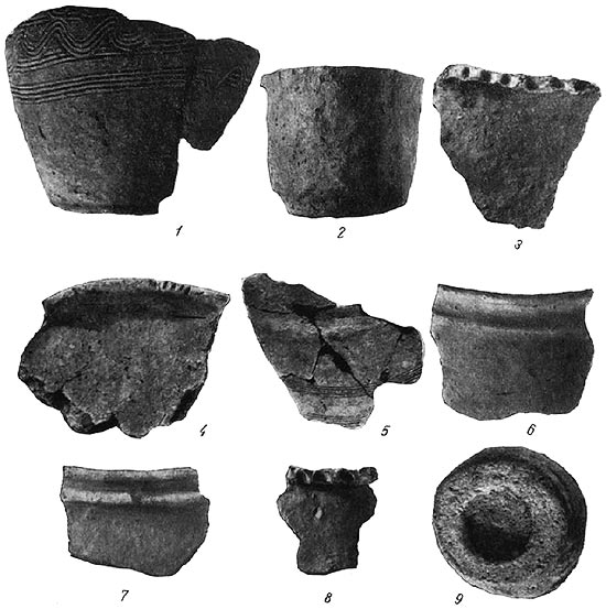 Нам кажется, что появление такого рода орнамента на лепной посуде следует связывать с проникновением сюда отдельных образцов гончарной керамики, для которой этот орнамент наиболее характерен. При изготовлении посуды на гончарном круге линейный и волнистый орнамент наносится простым прикосновением острия или гребенки к быстро вращающемуся сосуду.