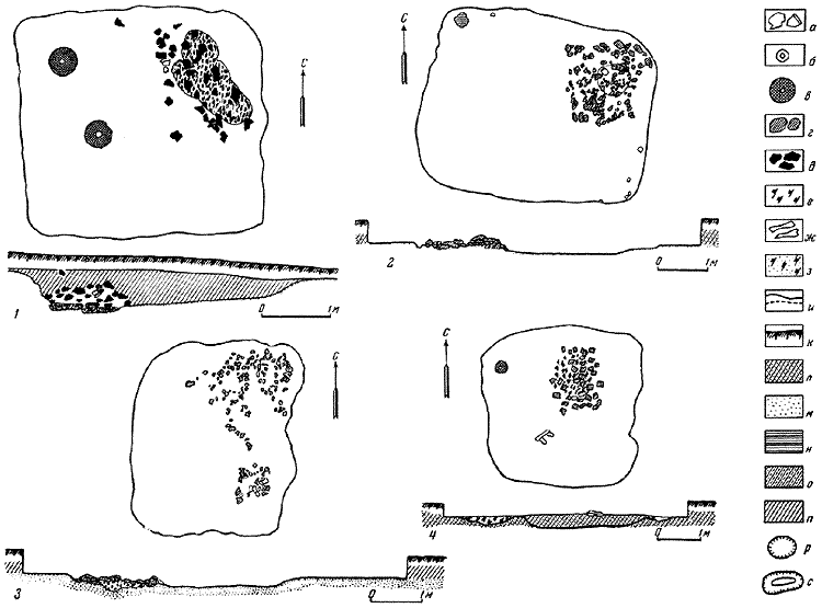 а – керамика; б – пряслице; в – жернова; г – камни; д – камни очажные; е – уголь; ж – кости; з – сажа в песке; и – контуры полуземлянок; к – пахотный слой; л – гумусированный песок; м – песок бурый; н – глина; о – песок темный; п – грунт смешанный; р – ямы; с – границы темного грунта.