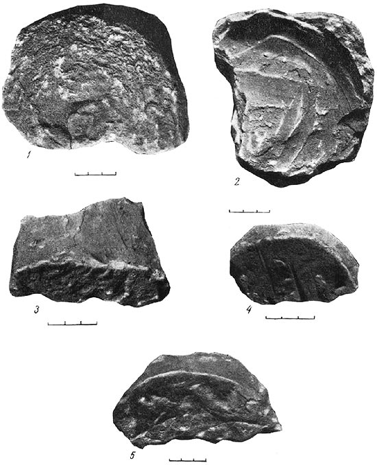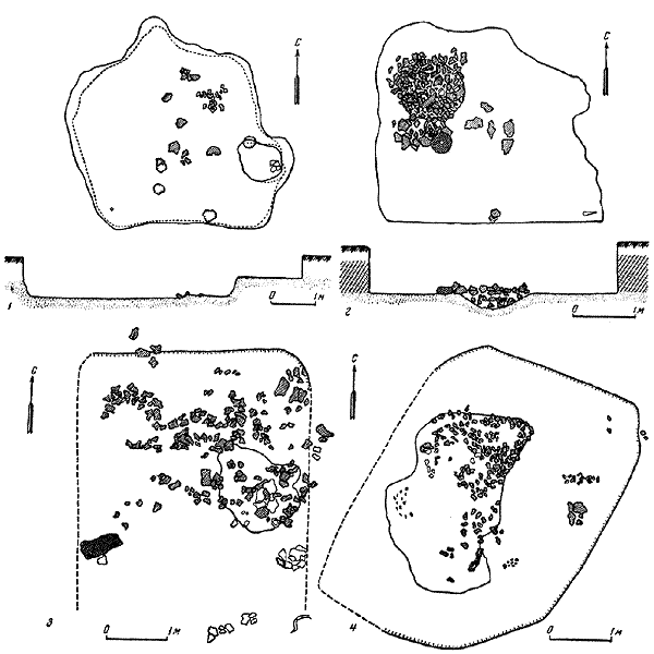 Помимо описанных жилищ, в разных местах на расчищенных площадях гряды были встречены отдельные комплексы находок, указывавших на остатки жилищ, контуры которых в силу условий залегания не прослеживались. Иногда это были скопления фрагментов керамики, иногда – скопления камней, обычно растащенные на значительной площади, что исключало возможность выяснить более точно место первоначального их залегания. В настоящей публикации нет особой надобности приводить описание всех этих остатков совершенно разрушенных жилищ и тем самым чрезмерно расширять текст.