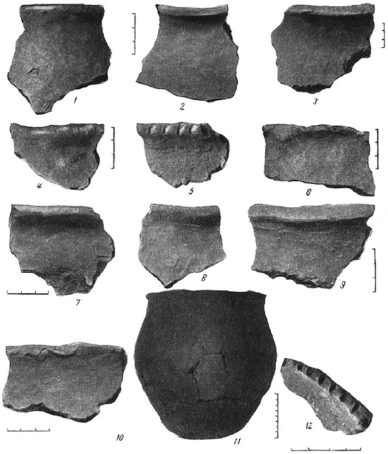 1-10 – фрагменты верхней части лепных сосудов; 11 – горшок лепной из жилища 7; 12 – обломок сковородки.