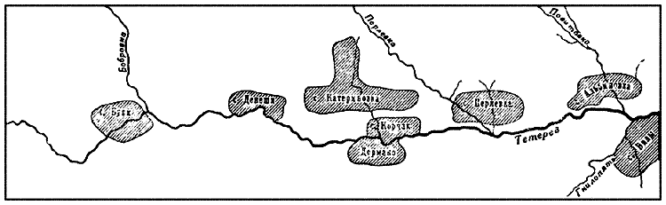 Рис. 1. План района, обследованного С.С. Гамченко в бассейне р. Тетерева.